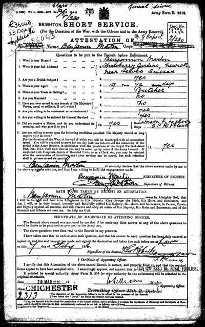 By 1911 the Martins were living in Strawberry Gardens in Newick, and Benjamin Jnr. was working as a domestic gardener. He was the only one of the Martin children still living at home, apart from a younger sibling named Bertie. However, one of his father’s uncles, also called Benjamin, was living with them by that date, resulting in the somewhat confusing scenario of three people named Benjamin Martin living under the same roof.